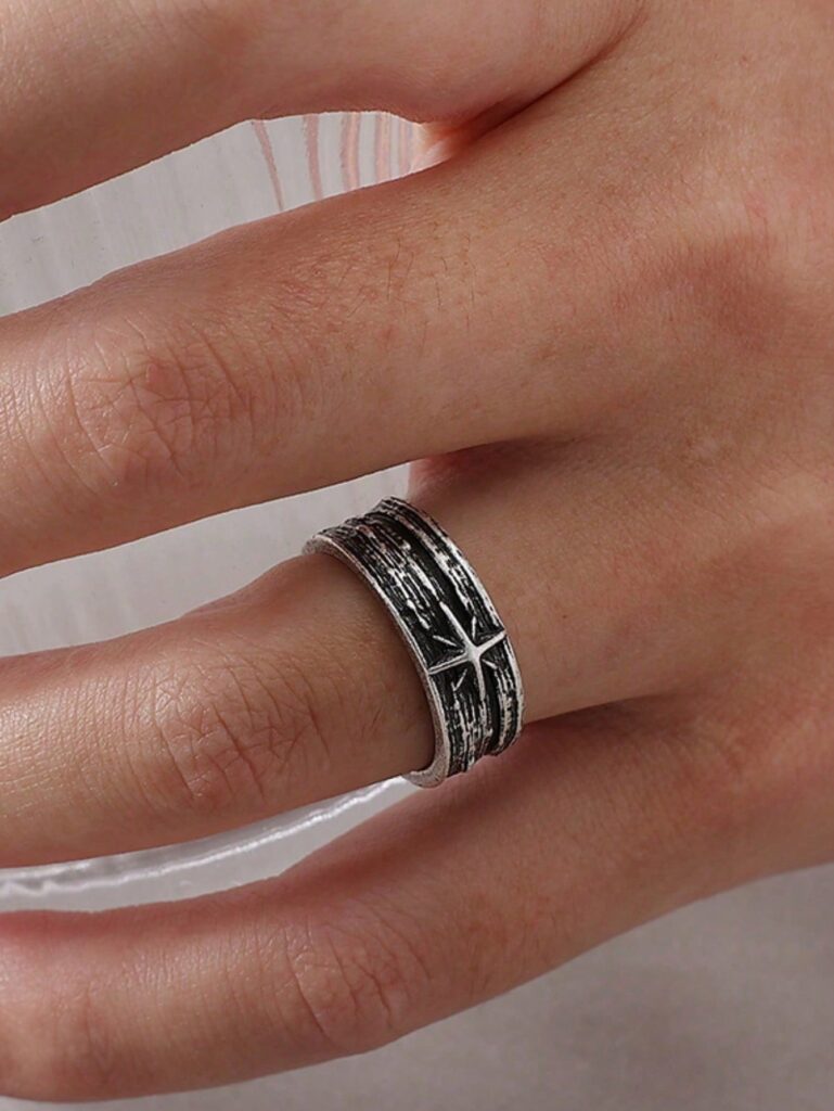 🛒ヴィンテージシルバースター装飾のオープンリング1個、男性の普段着、